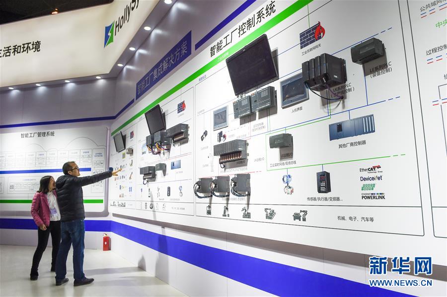 12月6日,觀眾在2017世界智能制造大會(huì)展示區(qū)和利時(shí)集團(tuán)展位參觀智能工廠控制系統(tǒng)。