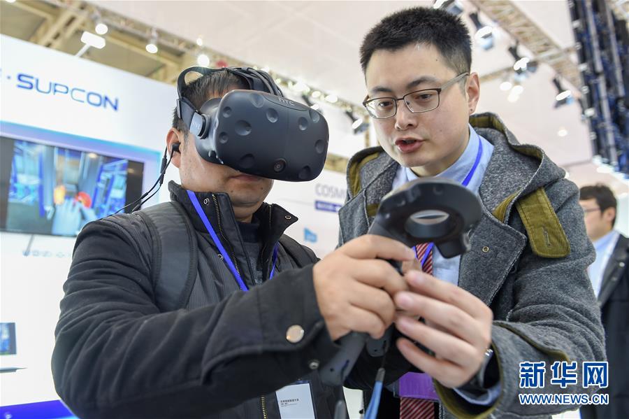 12月6日,在2017世界智能制造大會(huì)展示區(qū),一位市民在工作人員的幫助下進(jìn)行VR(虛擬現(xiàn)實(shí))體驗(yàn)。