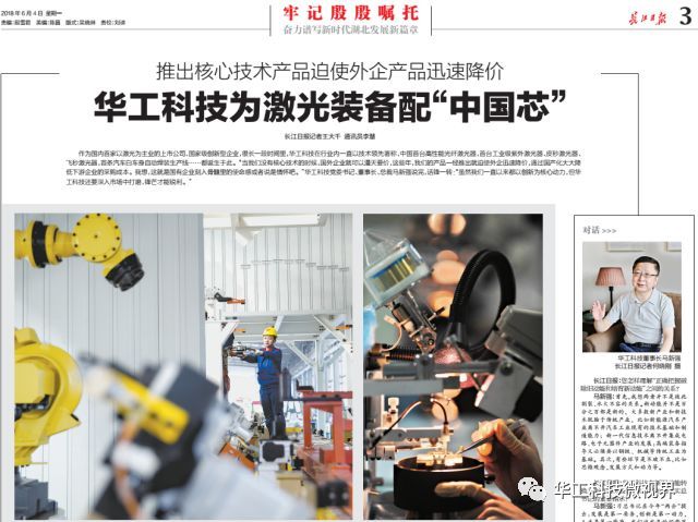 6月4日,《長江日報》3版牢記殷殷囑托,奮力譜寫新時代湖北發(fā)展新篇章專欄,推出整版報道《華工科技為激光裝備配中國芯》,聚焦