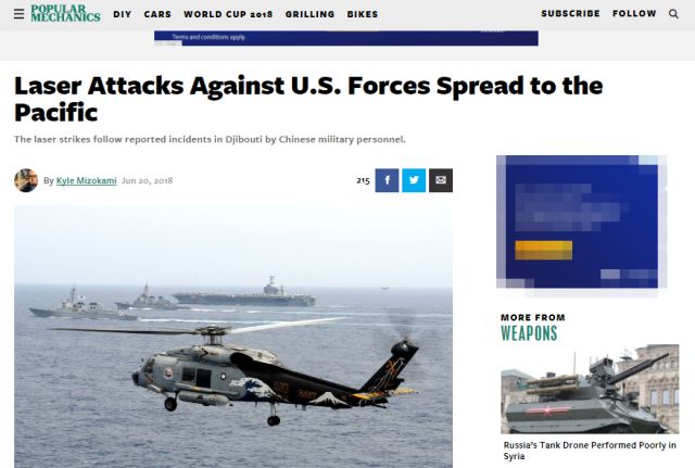 美國(guó)《大眾機(jī)械》雜志20日?qǐng)?bào)道稱,與今年早些時(shí)候在吉布提發(fā)生的“激光攻擊”一樣,在中國(guó)東海地區(qū)活動(dòng)的美軍人員也受到了致盲激光武器的襲擊。該雜志表示,這類非殺傷性激光武器是由中國(guó)制造的。