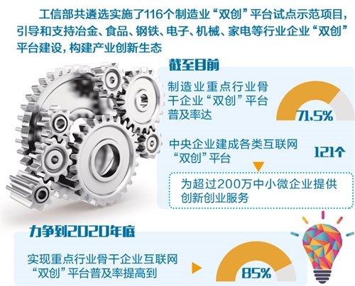 王新哲透露說,要繼續(xù)實施制造業(yè)“雙創(chuàng)”平臺建設專項,依托產(chǎn)業(yè)聚集區(qū),打造一批行業(yè)特色鮮明、創(chuàng)業(yè)增長較快、創(chuàng)新較為活躍、品牌影響力強、帶動作用顯著的制造業(yè)“雙創(chuàng)”示范區(qū),推動部省共建“雙創(chuàng)”示范基地。力爭到2020年底,實現(xiàn)重點行業(yè)骨干企業(yè)互聯(lián)網(wǎng)“雙創(chuàng)”平臺普及率提高到85%。