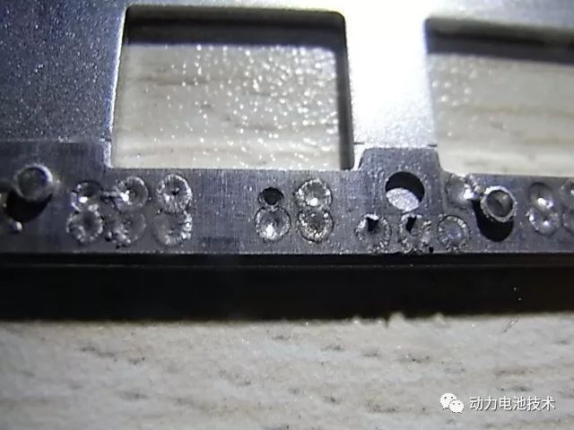 方形電池組合焊接時(shí),極柱或連接片受污染厚,焊接連接片時(shí),污染物分解,易形成焊接炸點(diǎn),造成孔洞;極柱較薄、下有塑料或陶瓷結(jié)構(gòu)件的電池,容易焊穿。極柱較小時(shí),也容易焊偏至塑料燒損,形成爆點(diǎn)。不要使用多層連接片,層之間有孔隙,不易焊牢。