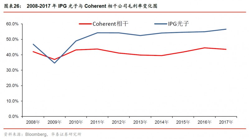 國內(nèi)廠商已掌握大部分器件制造技術(shù),但光纖介質(zhì)、高功率激光芯片和光纖光柵核心元器件仍依賴進(jìn)口,除此之外的核心元器件技術(shù)已被掌握,而國外激光器龍頭IPG光子、Coherent依靠全產(chǎn)業(yè)鏈整合實(shí)現(xiàn)產(chǎn)品低成本和性能高穩(wěn)定性。目前國內(nèi)廠商毛利率水平較高,核心元器件若進(jìn)一步國產(chǎn)化有望為國內(nèi)廠商業(yè)績提供充足支撐。