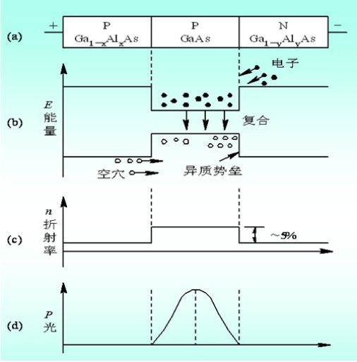 (a) 雙異質(zhì)結(jié)構(gòu); (b) 能帶; (c) 折射率分布; (d) 光功率分布