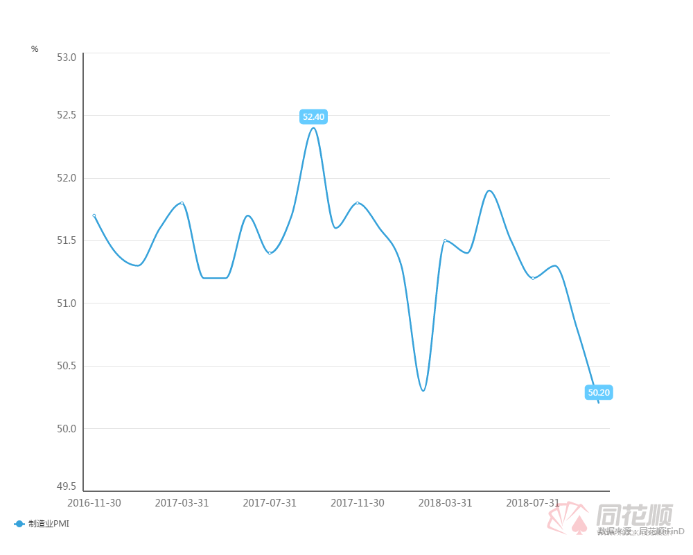 10月31日,國家統(tǒng)計局公布數(shù)據(jù)顯示,10月官方制造業(yè)和非制造業(yè)PMI分別為50.2和53.9,環(huán)比雙雙下降。制造業(yè)連續(xù)27個月高于臨界