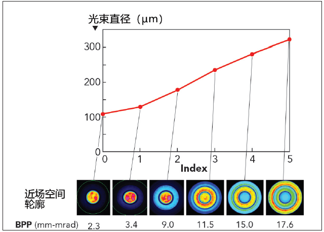 Corona光纖激光器輸出光束可在~100µm與~300µm之間連續(xù)調(diào)諧。為便于工藝優(yōu)化,提供了固定數(shù)字設置(指標值)。圖1顯示了帶六個指標設置的Corona光纖激光器的輸出光束直徑、光束參數(shù)結(jié)果(BPP)值和光束形狀。