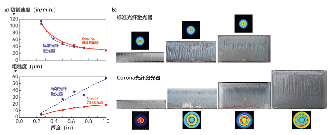 圖2:采用帶100μm 饋送光纖的標準4kW 光纖激光器與4 kW Corona 光纖激光器(a)進行氧氣輔助低碳鋼切割的對比,其中上圖顯示了切割速度,下圖顯示了測得的邊緣粗糙度值;照片顯示邊緣質(zhì)量,光束圖像包含于每張照片的上方或下方(b)。