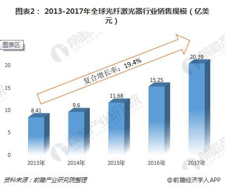 根據(jù)前瞻產(chǎn)業(yè)研究院發(fā)布的《2018-2023年中國激光產(chǎn)業(yè)市場前瞻與投資戰(zhàn)略規(guī)劃分析報(bào)告》,2017年全球光纖激光器的市場銷售規(guī)模突破20億美元,達(dá)到20.39億美元,2013-2017年的復(fù)合增長率接近20%。
