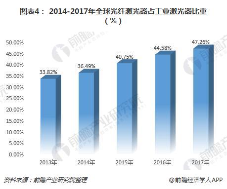 另外,從光纖激光器在工業(yè)激光器行業(yè)中的占比來看,光纖激光器在工業(yè)激光器行業(yè)中的比重逐年上升,從2013年的33.82%提升至2017年的47.26%。