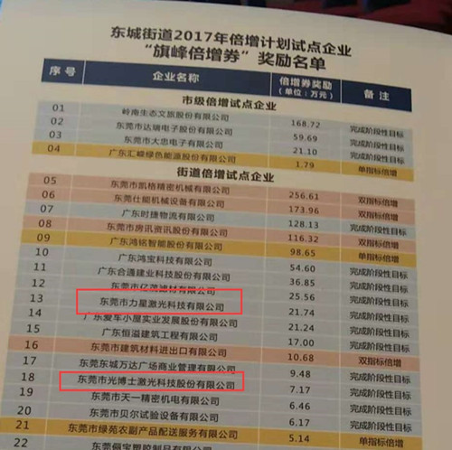 11月20日,東莞市東城街道舉行2017年倍增計(jì)劃試點(diǎn)企業(yè)表彰獎(jiǎng)勵(lì)會(huì)議。據(jù)獲悉,東莞市力星激光、光博士激光入選名單,分別獲得21.74萬和7.17萬元的獎(jiǎng)勵(lì)。