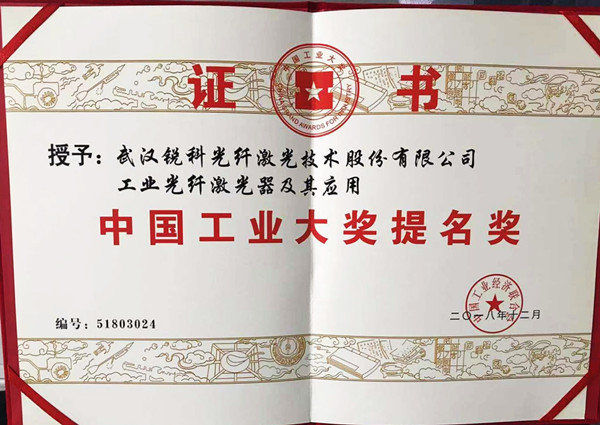 圖:銳科激光中國(guó)工業(yè)大獎(jiǎng)提名獎(jiǎng)證書