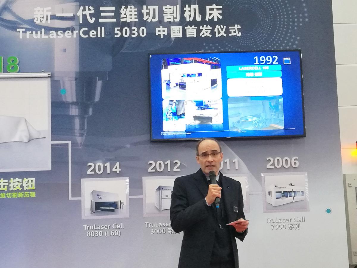 在揭幕儀式上,通快(中國)有限公司激光技術(shù)部總經(jīng)理Volker Kuehnle先生以流利的中文回顧了通快三維激光系統(tǒng)發(fā)展的12年歷程——2006年首推TruLaser Cell 7000系列,2011年推出TruLaser Cell 8030(L45),2012年推出TruLaser Cell 3000系列,2014年推出TruLaser Cell 8030(L60),直到今天正式中國市場推出TruLaser Cell 5030。