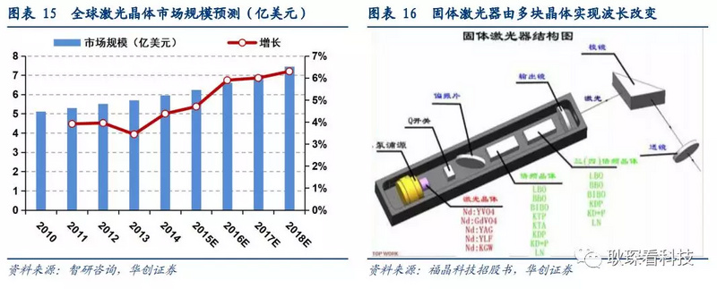 晶體需求彈性大,微加工領(lǐng)域的固體激光器需求增加有望帶動其增長。晶體主要應用于固體和光纖激光器,占激光器總價值約5%,其中占固體激光器總價值約10%。固體紫外激光器需要多塊晶體倍頻以達到理想的波長輸出。此外由于各類晶體的使用壽命一般短于激光器使用壽命(受環(huán)境影響較大),以福晶為例,主要產(chǎn)品LBO、BBO、KTP、Nd:YVO4等品質(zhì)保證期均為“一年內(nèi)正常使用”,因此需定期更換晶體,賦予了晶體需求更大的彈性。