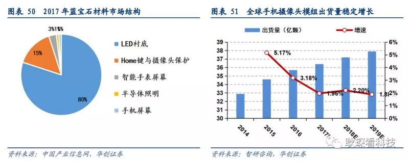 2. 藍寶石市場空間可觀:藍寶石晶體集優(yōu)良的光學、化學、物理性能于一身,具有強度高、硬度大、耐沖刷等特性,而藍寶石的切割加工離不開激光工藝。主要應用有:LED襯底、智能機攝像頭保護、Home 鍵、藍寶石表鏡等。據(jù)智研咨詢數(shù)據(jù),LED襯底對藍寶石需求量占比最大,達80%以上;其次為Home鍵與攝像頭,占比約為15%。而在LED產(chǎn)品的應用中,手機及其他電子設(shè)備占比高達59%。在智能機攝像頭應用上,雙攝已成主流,華為開啟三攝時代,未來四攝時代也已不遠,藍寶石的鏡頭防護應用的需求料將持續(xù)增長。據(jù)YOLE數(shù)據(jù),預計到2019年,藍寶石市場規(guī)模將達到81.85億美元,近8年年均復合增長率達57%,前景十分可觀。