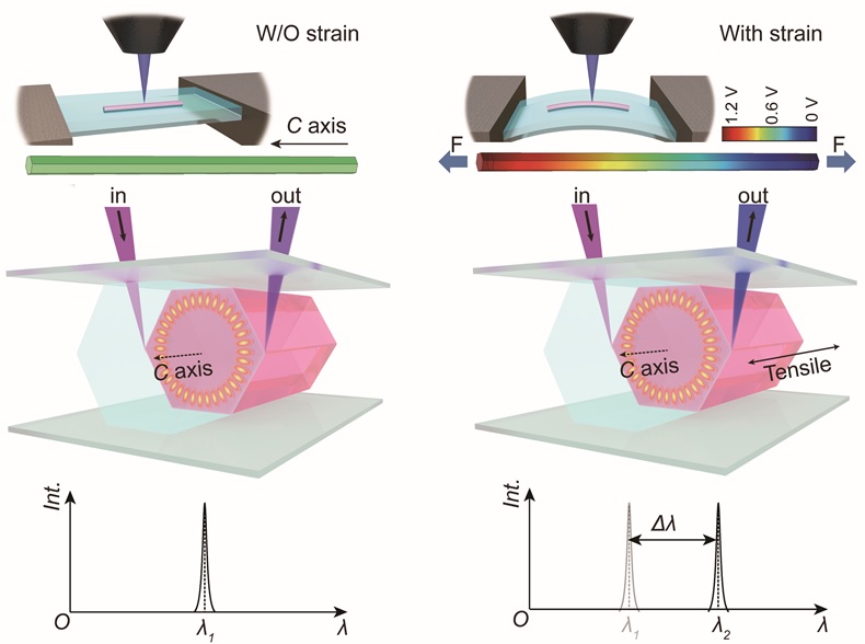 近日,中國科學(xué)院北京納米能源與系統(tǒng)研究所王中林、潘曹峰及盧俊峰在先前報道的動態(tài)調(diào)控ZnO回音壁激光模式的基礎(chǔ)上,利用壓電極化效應(yīng)和壓阻效應(yīng)協(xié)同作用,對激光模式進(jìn)行選擇性輸出,并實現(xiàn)單模激光輸出與動態(tài)調(diào)控,也為進(jìn)一步推進(jìn)以顏色分辨為信號源的應(yīng)力傳感器構(gòu)建件打下堅實的基礎(chǔ)。相關(guān)成果以Dynamic Regulating of Single-Mode-Lasing in ZnO Microcavity by Piezoelectric Effect 為題發(fā)表在近期的Materials Today上。