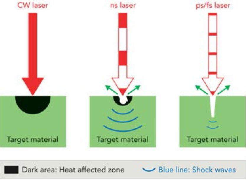 人們很早就嘗試?yán)眉す膺M(jìn)行微加工。但是由于激光的長脈沖寬度和低激光強(qiáng)度造成材料熔化并持續(xù)蒸發(fā),雖然激光束可以被聚焦成很小的光斑,但是對(duì)材料的熱沖擊依然很大,限制了加工的精度。唯有減少熱影響才能提高加工質(zhì)量。