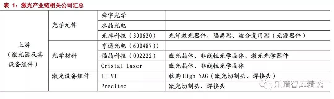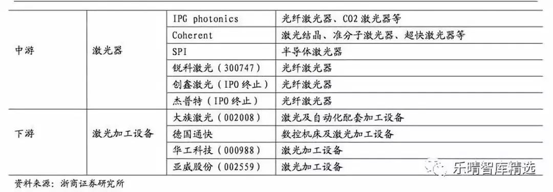 激光產(chǎn)業(yè)鏈可分為三部分,上游主要包括光學(xué)材料及元器件、電控和機(jī)械件等,中游主要為各種激光器及其配套設(shè)備,國外主要廠商有美國的IPG公司、英國SPI,國內(nèi)主要廠商有銳科激光、創(chuàng)新激光;下游則以激光應(yīng)用產(chǎn)品、消費(fèi)產(chǎn)品、儀器設(shè)備為主。