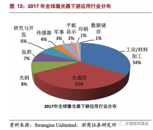 激光行業(yè)下游應(yīng)用廣泛,工業(yè)/材料加工激光器市場占比最大,達(dá)到34%。2017年全球124.3億美元激光器市場中,材料加工是最大的應(yīng)用市場,占比約34%,市場空間約43億美元。其次是光通信和光刻市場,分別占比33%、8%。