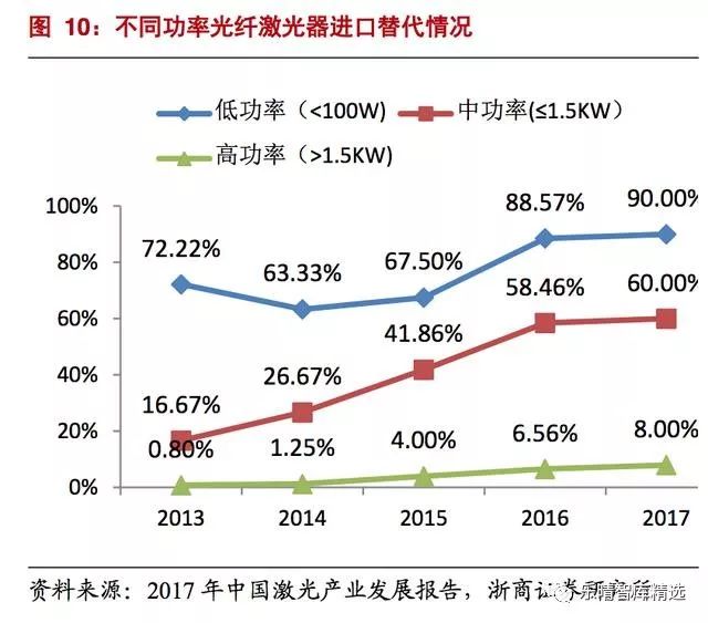 目前低功率的已基本實(shí)現(xiàn)進(jìn)口替代,中功率市場國產(chǎn)化率超過50%,而大功率激光器仍被外資廠商壟斷,進(jìn)口替代空間較大。