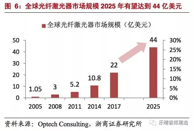 未來光纖激光器滲透率將繼續(xù)增長,OptechConsulting預(yù)計(jì)到2025年全球市場規(guī)模將達(dá)到44億美元,較2017年翻番。