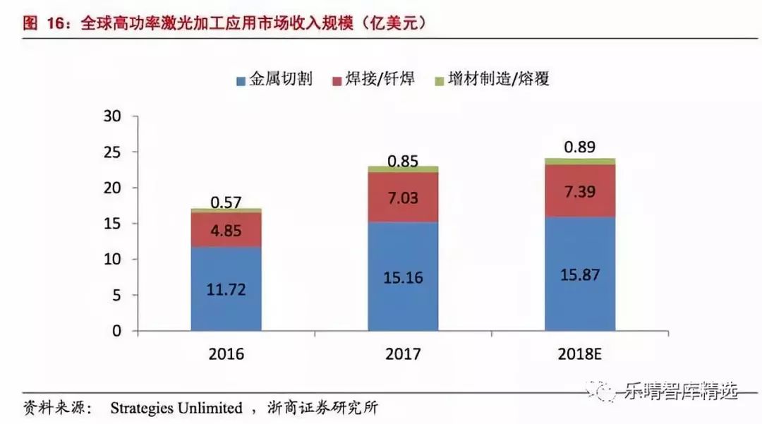 2017年,全球工業(yè)激光器在材料加工方面的應(yīng)用中,切割應(yīng)用占35%,焊接應(yīng)用占16%,打標(biāo)應(yīng)用占15%。