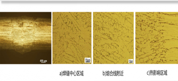 針對(duì)激光功率 2 kW、焊接速度為 0.5 m/min 獲得焊縫橫截面繼續(xù)拋光輻射,并放大 50 倍,測(cè)量焊接接頭的焊縫中心區(qū)域、熔合線和熱影響區(qū)組成,結(jié)果如圖7所示。可以觀察到焊縫中心主要以骨架狀等軸晶組織為主,偏離焊縫中心的熔合線附近為垂直于熔池邊界向焊縫中心生長(zhǎng)的柱狀晶組織,由于焊接熱影響,熱影響區(qū)晶粒發(fā)生回復(fù)和再結(jié)晶,形成晶粒尺寸略大的沿軋制方向的晶粒組織。造成焊縫不同區(qū)域組織的差異主要與凝固過(guò)程中的溫度梯度大小有關(guān),在焊縫中心區(qū)域由于冷卻速度較快,熔池中心溫度梯度小,因此形成細(xì)小的等軸枝晶組織,而越靠近熔合線附近,溫度梯度越大,晶粒沿與熔合線方向垂直向焊縫中心生長(zhǎng),形成略微粗大的柱狀晶組織。