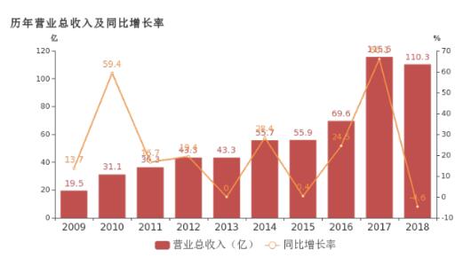大族激光于2019年4月23日披露年報(bào),公司2018年實(shí)現(xiàn)營(yíng)業(yè)總收入110.3億,同比下降4.6%;實(shí)現(xiàn)歸屬于母公司所有者的凈利潤(rùn)17.2億,同