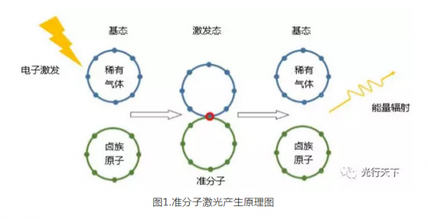 準分子激光器是以準分子作為工作介質(zhì)的一類氣 體激光器,工作介質(zhì)主要為稀有氣體(Ar, Kr, Xe等)和 鹵族元素(F, Cl, Br等),常采用電子束或脈沖放電的形 式實現(xiàn)泵浦(如圖1所示)。處于基態(tài)的稀有氣體原子 受到激發(fā)后,核外電子躍遷到更高能級的軌道從而改 變原有最外層電子充滿的結(jié)構,并與其他原子結(jié)合形 成分子,當激發(fā)態(tài)的分子躍遷回到基態(tài)時,又離解成 原來分立的原子,能量以光子的形式放出,經(jīng)諧振腔 放大后,變?yōu)榫哂懈吣芰康淖贤饧す?。準分子激光?通過使用不同工作介質(zhì)實現(xiàn)輸出不同激光波長,比如 Xe2F激光器可輸出最長的波長(610±65) nm,Ar2激光 可輸出最短的波長126nm。常見準分子激光器還包括 ArF 激光器(193 nm),KrF 激光器(248 nm)和 XeCl 激 光(308 nm)等。