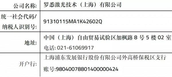 • 羅悉激光中國的注冊信息、銀行賬號及增值稅信息