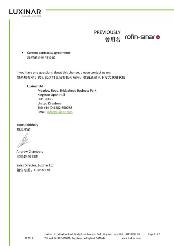 附件:Luxinar Ltd.全球銷售總監(jiān)Andrew Chambers先生關(guān)于啟用新品牌的通告函。