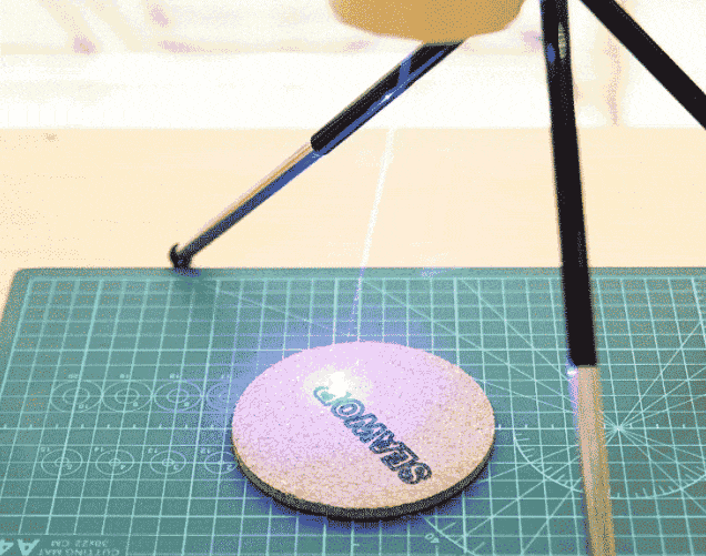 支持雕刻的材質(zhì)很豐富,包括:厚紙板、軟木、布料、毛氈、皮革、木頭、塑料、EVA印章等。略微遺憾的是,金屬、石頭等硬質(zhì)材料還無法雕刻。把要雕刻的物件放在它的下方,在手機(jī)App上輸入圖案即可開始雕刻。