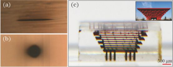 3Foturan玻璃中(a)傳統(tǒng)聚焦和(b)時(shí)空聚焦焦點(diǎn)的截面顯微圖像; (c)利用時(shí)空聚焦系統(tǒng)在Foturan玻璃內(nèi)部直寫的中國(guó)館結(jié)構(gòu)