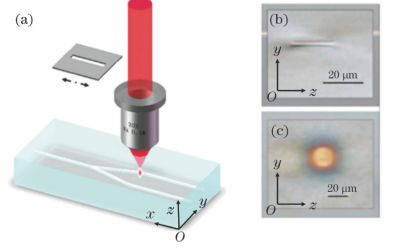 圖1(a)飛秒激光狹縫整形直寫的實(shí)驗(yàn)裝置示意圖; (b)傳統(tǒng)方式聚焦直寫的波導(dǎo)截面; (c)狹縫整形直寫的波導(dǎo)截面