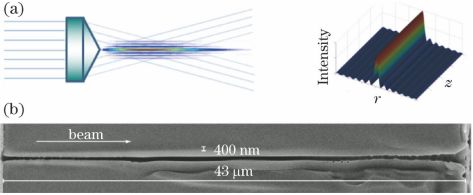 4(a)角錐棱鏡產(chǎn)生的貝塞爾光束及其光強(qiáng)分布示意圖; (b)使用貝塞爾光束在玻璃中制備高深徑比的納米通道SEM圖像