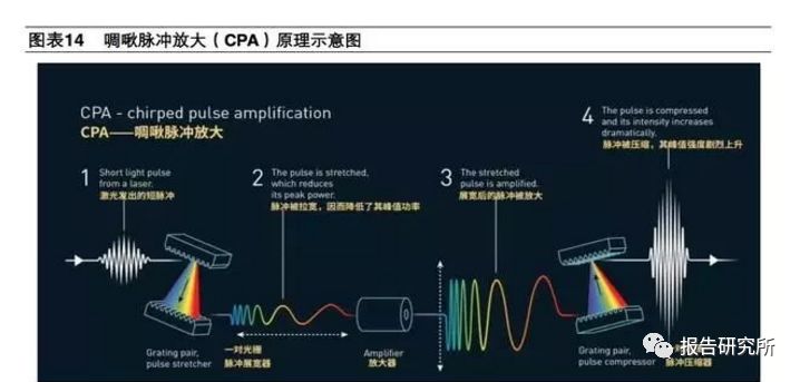 CPA技術(shù)的基本原理是先利用一對光柵將初始脈沖激光拉寬,利用放大器把拉寬的激光放大,最后使用另一對光柵將激光脈沖壓縮,得到瞬時(shí)的高功率。