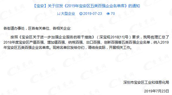 7月23日,深圳市寶安區(qū)工業(yè)和信息化局印發(fā)2019年寶安區(qū)五類百?gòu)?qiáng)企業(yè)名單庫(kù),包括產(chǎn)值百?gòu)?qiáng)、增加值百?gòu)?qiáng)、納稅百?gòu)?qiáng)、出口百?gòu)?qiáng)、創(chuàng)