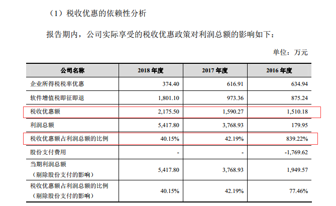 招股書顯示,報(bào)告期內(nèi),光大激光享受稅收優(yōu)惠金額分別為1510.18萬元、1590.27萬元和2160.50萬元,占當(dāng)期利潤(rùn)總額的比例分別為839.22%、42.19%和40.15%。其中,軟件產(chǎn)品增值稅即征即退的金額分別為875.24萬元、973.36萬元和1801.10萬元,呈大幅增長(zhǎng)態(tài)勢(shì),分別占當(dāng)期利潤(rùn)總額的486.38%、25.83%、33.24%。