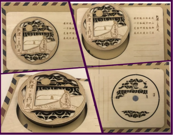 創(chuàng)意說明:利用激光與木材結(jié)合,加入每個景區(qū)的特色,使其更具有美觀性;采用景區(qū)特色,利用激光雕刻,生產(chǎn)出明信片使其具有紀念性;再加入激光切割與粘合的工藝,做出多層立體圖樣,突出產(chǎn)品立體感;冰箱貼與明信片相結(jié)合,使產(chǎn)品更加具有多功能性。