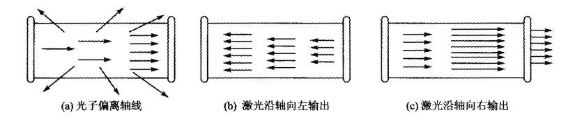 當(dāng)工作物質(zhì)產(chǎn)生受激福射時(shí),受激輻射在兩反射鏡之間作一定次數(shù)的往返反射,而每次返回時(shí)都會(huì)經(jīng)過建立了粒子數(shù)反轉(zhuǎn)分布的工作物質(zhì),這樣將使受激輻射一次又一次地加強(qiáng),如下圖所示。這樣幾十次、幾百次的往返,直至能獲得單方向的強(qiáng)度非常集中的激光輸出為止。我們把激光在共振腔內(nèi)的往返放大過程叫做振蕩放大。被激發(fā)的工作物質(zhì)中的某些原子受激輻射而放出光子,如果發(fā)射方向正好和腔軸線平行,則可能在腔內(nèi)起放大作用。一部分偏離軸線方向的光子則跑出腔外面而成為一種損耗,如圖(a)所示。若光在來回反射過程中,放大作用克服了各種衰減作用(如共振腔的透射、工作物質(zhì)對(duì)光的散射和吸收等),就形成穩(wěn)定的光振蕩而產(chǎn)生激光,以很好的方向沿軸向輸出,如圖(b)和圖(c)所示。