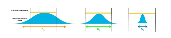 那么,當不同的光束尺寸應用于相同的光圈時會發(fā)生什么?非常簡單,如下圖所示—當激光束溢出透明孔徑時,激光束的外環(huán)部分將被夾住。這將我們帶到下一個問題,適用于某個通光孔徑的光束直徑是多少?