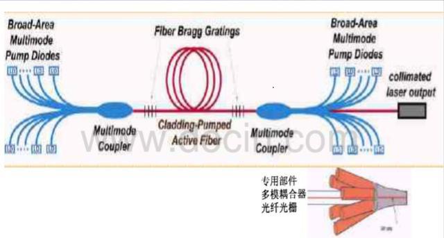 我們簡(jiǎn)單看一下光纖激光器的原理和構(gòu)造,它是由泵浦源、多模耦合器 (合束器)、光纖光柵、有源光纖、光束校準(zhǔn)輸出模塊以及無源光纖(能量輸出光纖)等組成。當(dāng)激光器內(nèi)部只有一個(gè)泵浦模塊時(shí),就稱之為單模激光器,而多個(gè)泵浦模塊組合在一起,通過合束器讓多束泵浦光進(jìn)入有源光纖中,這樣可以得到更高功率的光束,這種多模塊組合的激光器就是多模激光器。因而,主流的光纖激光器產(chǎn)品中,單模激光器大都為中小功率,而高功率產(chǎn)品則多是多模激光器。