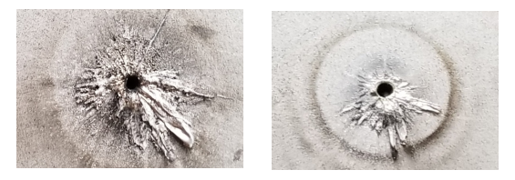 圖4 使用2000瓦激光對10mm304不銹鋼進行穿孔對比(輔助氣體為氮氣)普通脈沖穿孔(左) ,增強型脈沖穿孔(右)