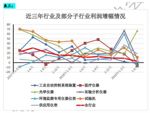 2、利潤(rùn)。利潤(rùn)總額增幅低于營(yíng)收增幅4.7個(gè)百分點(diǎn),其中:光學(xué)儀器利潤(rùn)增幅高于營(yíng)收增幅20多個(gè)百分點(diǎn),衡器、地質(zhì)儀器、供應(yīng)用儀表的利潤(rùn)增幅亦遠(yuǎn)高于營(yíng)收增幅,實(shí)驗(yàn)分析利潤(rùn)增幅基本穩(wěn)定;而醫(yī)療儀器、汽車(chē)儀表、環(huán)境監(jiān)測(cè)等幾個(gè)分行業(yè)利潤(rùn)增幅遠(yuǎn)低于營(yíng)收增幅,自動(dòng)化儀表行業(yè)的利潤(rùn)增幅僅為-1.58%;行業(yè)增產(chǎn)不增收或增收不增利的情況加劇,盈利能力提升壓力很大。