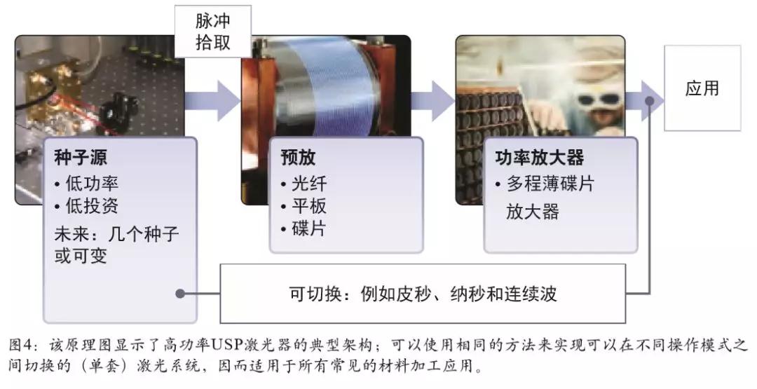 提供高平均功率的超短脈沖激光系統(tǒng),都基于小的種子振蕩器和一個(gè)或多個(gè)放大級(jí)(圖4)。重要的是,在高平均功率下,這些放大器(例如片狀預(yù)放大器和多程碟片功率放大器)對(duì)于超短脈沖或CW輻射同樣有效。因此,通過集成額外或更靈活的種子源,沒有技術(shù)上的原因會(huì)阻礙我們建立一個(gè)可以在CW和脈沖或 USP 操作之間切換的單套激光系統(tǒng)。