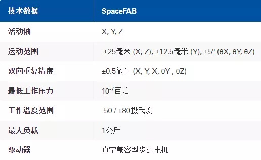 這一任務(wù)通過一個(gè)SpaceFAB定位機(jī)器人完成,其可在所有直線和角度方向上實(shí)現(xiàn)六自由度運(yùn)動(dòng)。SpaceFAB專門針對(duì)高真空使用而定制,極其緊湊,配備真空兼容型步進(jìn)電機(jī),可適用于-50至+80攝氏度的溫度范圍。
