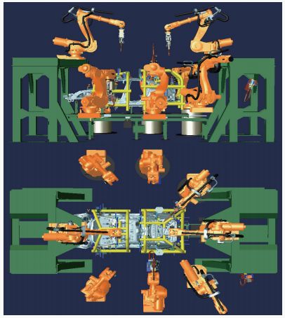 華工激光和成焊寶馬開(kāi)發(fā)的焊接系統(tǒng)中,預(yù)拼車(chē)身通過(guò)傳輸系統(tǒng)到達(dá)車(chē)身成型工位,同時(shí)車(chē)身識(shí)別系統(tǒng)切換地板定位夾具,降下落入的地板定位夾具中,4個(gè)機(jī)器人同時(shí)抓舉4套車(chē)身定位網(wǎng)架式夾具,在車(chē)身上進(jìn)行裝配快速定位鎖緊;機(jī)器人通過(guò)工具切換系統(tǒng),脫開(kāi)定位夾具;夾具夾緊車(chē)身。機(jī)器人同時(shí)抓起焊鉗和其他幾個(gè)機(jī)器人一起對(duì)車(chē)身進(jìn)行焊接。焊接完成后,抓舉機(jī)器人放下焊鉗,然后抓取定位夾具離開(kāi)車(chē)身;車(chē)身升起,傳入下個(gè)工位中;在4個(gè)機(jī)器人的抓取范圍內(nèi)布置4套旋轉(zhuǎn)裝置,可儲(chǔ)存夾具。每套旋轉(zhuǎn)裝置可分上下兩層,每層可存儲(chǔ)6套夾具。