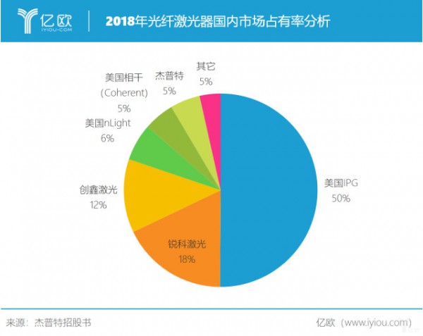 從2018年光纖激光器的市場占有率來看,開創(chuàng)了中國商用脈寬可調(diào)高功率脈沖光纖激光器先河的杰普特,也難逃被巨頭排擠的厄運。數(shù)據(jù)表明,2018年杰普特的光纖激光器份額僅占國內(nèi)市場的5%,以美國IPG為主的光纖激光器企業(yè)占領了國內(nèi)60%的市場份額。