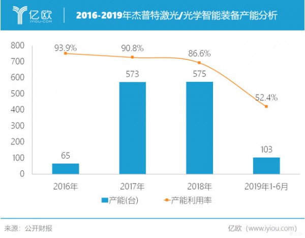 事實上,杰普特的總利潤下滑還與其激光/光學智能裝備產(chǎn)能驟減密不可分。從近幾年的激光/光學智能裝備產(chǎn)能來看,其產(chǎn)品產(chǎn)能在2017年和2018年分別為573臺和575臺,但在今年的上半年,驟降至103臺,與前兩年同期對比差距較大,杰普特準備切換“戰(zhàn)術”了嗎?