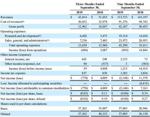 當(dāng)?shù)貢r(shí)間11月4日,高功率半導(dǎo)體和光纖激光器的領(lǐng)先供應(yīng)商恩耐公司公布了2019年第三季度的財(cái)務(wù)業(yè)績(jī)。報(bào)告顯示,恩耐2019年第三季度的收入為4381.4萬(wàn)美元,同比下降14.1%;凈虧損80萬(wàn)美元,去年同期凈利潤(rùn)為400.9萬(wàn)美元;第三季度毛利率為29.6%,同比下降6個(gè)百分點(diǎn)(2018年第三季度為35.4%)。而2019年前三季度總營(yíng)收為1.34億美元,同比下降7.9%;凈虧損為216.8萬(wàn)美元,去年同期凈利潤(rùn)為1157.8萬(wàn)美元;毛利率為31.7%,同比下降3個(gè)百分點(diǎn)(2018年前三季度為34.8%)。
