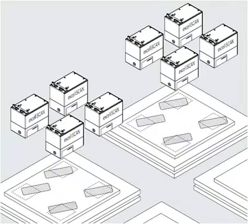 在多頭系統(tǒng)中的掃描頭可以靈活布置和配置.除了圖6所示的布局之外,還可以橋接四個彼此相鄰的掃描儀. 各掃描頭之間能夠?qū)崟r同步,保證了整個系統(tǒng)的精度。這樣的布局實(shí)現(xiàn)了多個工件的并行加工。如此一來,用戶可以自由地調(diào)整各個掃描頭下的工件方位與方向,使得用戶對工件的定位和方向進(jìn)行自動檢測(例如圖像識別)得以完成.若在XL SCAN上再附加一個機(jī)械軸,那么掃描頭之間間距也可以在軟件中修改和定義。